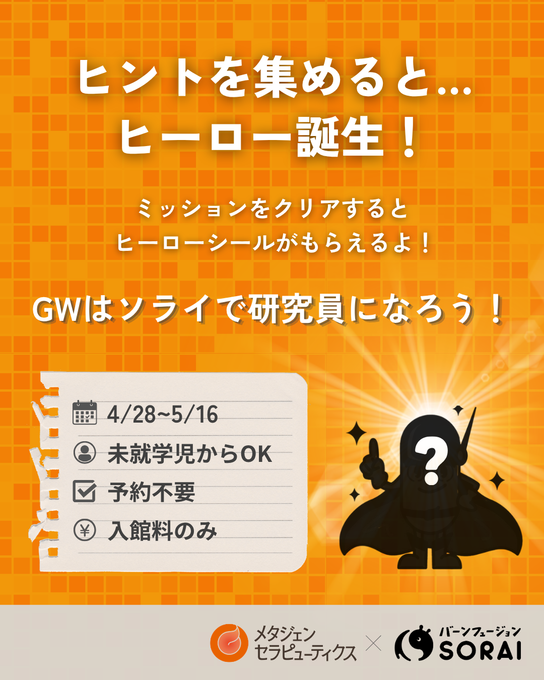 4/28~5/16開催🎉メタジェンセラピューティクス × SORAI 「未来のおくすり研究所クエスト」💊